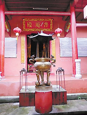 普庵殿门口的对联是:普宇佛光照三界,庵殿祥瑞满禅林。门口的香炉刻的是“风调雨顺”、“国泰民安”八个大字。