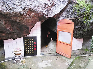 笔者来到祖师洞,只见石壁上几个刻于乾隆四十年初冬的四个大字:无为而威。祖师洞门口有一首七绝,上书:藏界如心太古洞,仙家盘踞五百芳;妙显应缘至善德,迎母神光印顶相。相传当年普庵祖师之母黄氏,先不知普庵祖师遁隐于何处,心思念之。后因刘汝明、丁骥等人寻找见到普庵祖师后,黄氏乃来看望普庵祖师。普庵祖师见母亲来,慌忙出迎,不觉起身,头触石岩上。笔者在祖师洞中看到至今仍留一穴,深二三寸,顶印清晰可辨。