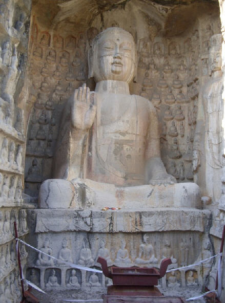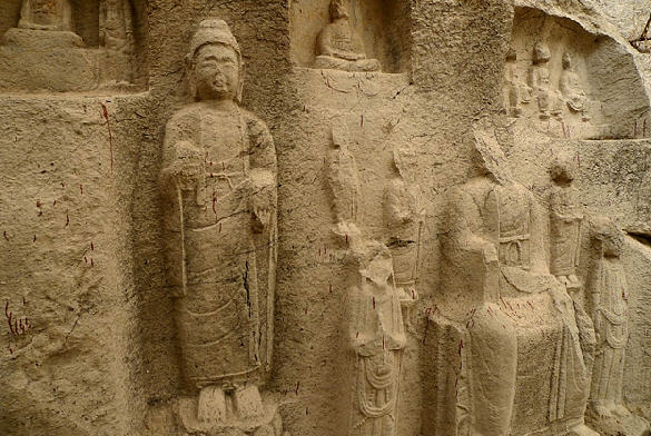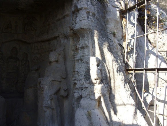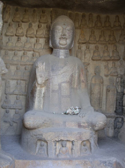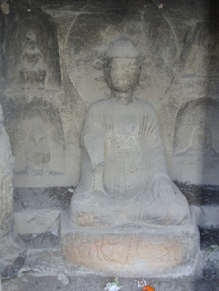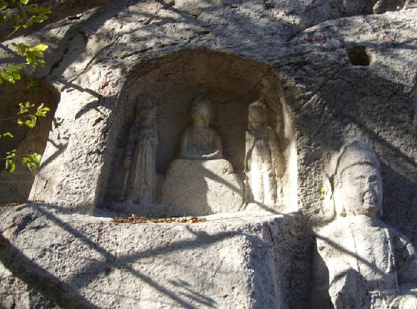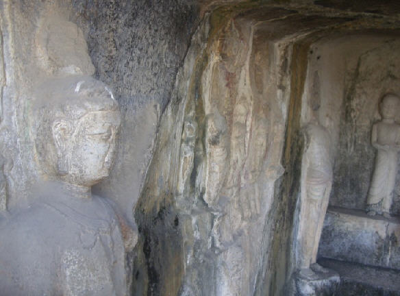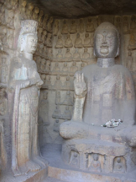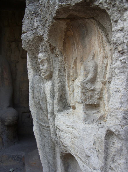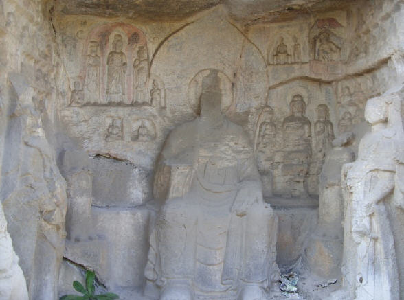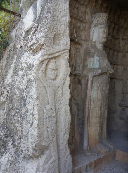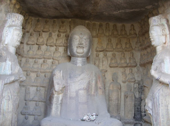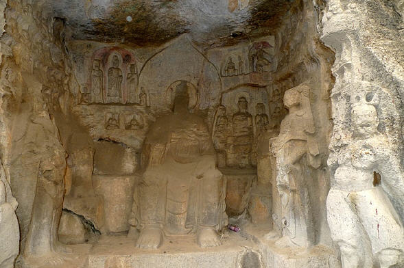最左边的一窟造像为唐朝前期的作品,开凿于武则天执政时期。僧侣们为了迎合武则天的政治需求,有意把主佛雕为女性形象。所以,本窟主佛造像体态丰满端庄,面部圆润慈祥,颈佩莲花项链,臂带金钏,胸部隆起,隐隐透出女性丰韵。主佛身边是她的两位弟子,左边是迦叶,右边是阿难。两边的菩萨像亭亭玉立,颈下佩饰着极为复杂的璎络项圈,手佩臂钏,上身袒露,头梳螺旋式发髻,手持一朵鲜花,腰间裹以袜肚,肩上的帔帛飘然下垂,下身如蝉翼般的长裙紧贴肢体,勾勒出女性所独具的优美曲线,恰似出水芙蓉,被许多前来观赏的艺术家称为“东方维纳斯”。