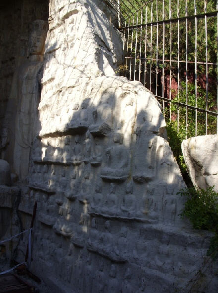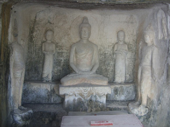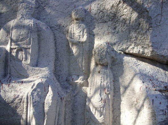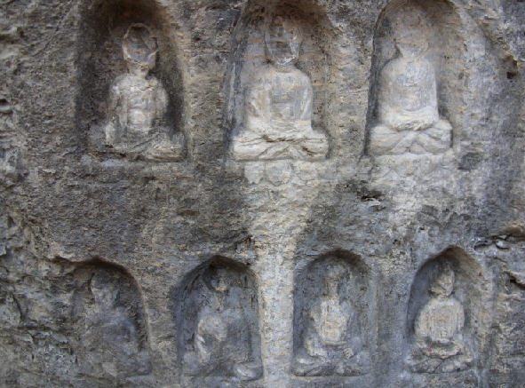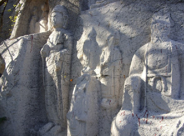 石窟是古代一种就着山崖开凿成的寺庙建筑,里面有佛像或佛教故事的壁画和石刻等;而摩崖则是将文字、佛像直接刻在山崖上。驼山石窟造像群,唐时称为驼山寺。共有石窟5座,摩崖1处,大小造像638尊。这些佛像大小不一,高至5米,小不足10厘米,但刻工皆精细入微。造像题材多为西方的三圣像,即正面的阿弥陀佛和两旁的观世音、大势至二菩萨,其次是千佛像、力士像、飞天像及较小的供养人像等。这些造像,造形精美奇特,雕工流畅细腻。其隽美的女性形象和奇异的服饰,常使前往考察的专家和观光游客赞叹不已,流连忘返。