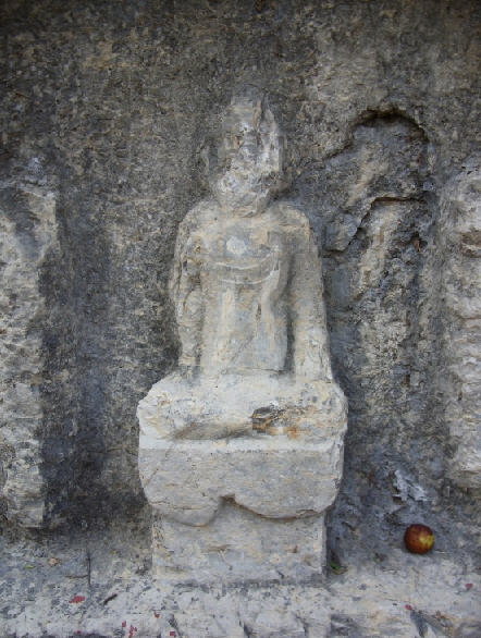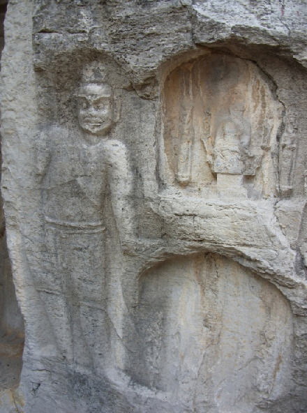 左边第二窟保存最为完整。中间阿弥陀佛,面目清秀,嘴角上翘,似在微笑,身着袈裟,上有用赭石色绘出的方格。两边雕有两尊菩萨,头上高冠造型奇异,雕有复杂花纹,并有化佛和宝瓶,冠两旁有较大的如翅,如翅上引出两条下垂的飘带,颈部佩有连珠状的项链和极为精致的璎珞,长裙曳地,宽阔的裙带下垂至脚面,微笑的面孔、亭亭玉立的身材,栩栩如生,呼之欲出。门边两位力士,赤裸上身,怒目圆睁,手举兵器,是力量的像征。犹为奇特的是,在北边石壁下方,有一个西方弟子雕像,头戴瓜皮小帽,身穿翻领长袍,腰系皮带,足蹬尖头皮靴,波斯人的相貌雕刻得生动形象,此为青州石窟造像一绝。为什么将身穿翻领西服的波斯人雕刻在石窟中,是他信佛?还是为佛教做出过贡献?不得而知。