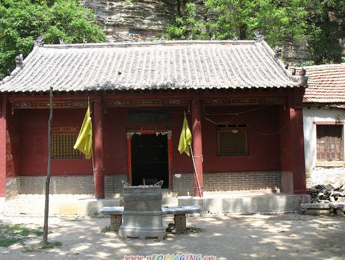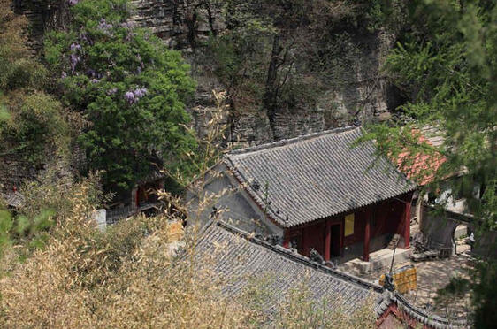 寺院坐西朝东。入院即见院之正西,南北各有一排整齐森严的庙宇古建筑,其建筑用石多采自就近的山岩之上,或开采于就近的地表之上。石料巨大,而稍做加工就成了千斤重的大条石,为庙宇增添了许多极佳的古朴凝重气质。悬泉在寺院的西北角,泉水从正北面的悬崖上的一缝隙中淅沥而出,水质极清;从山下至山上,人多已困渴,望见山泉,无有不兴奋的,用手盛水而饮,手凉爽之惬意自不必言,入口后则更知山泉水之胜。泉侧不远又有一曲径直抵另一悬崖。沿曲径而上,至悬崖下,可见自崖脚下生出的三棵巨大的古藤。古藤花开紫红色,阳光下,花色娇艳无比。每年的三月末或四月初古藤花盛时,古藤花下游人如织;古藤花上蜜蜂嗡嗡,形成了一幅游人与蜜蜂争花,人又与人争相赏花的壮观场面。古藤西南不远处,也是这一处山中最幽处,有一片小篁竹,无论竹叶还是竹枝竹干,都是一色青翠欲滴。篁竹并不倚势霸道,与相临各色花草,大小植物共生,尽皆茂盛。坐其一处,即有“山不在高,有仙则名”的舒畅了。