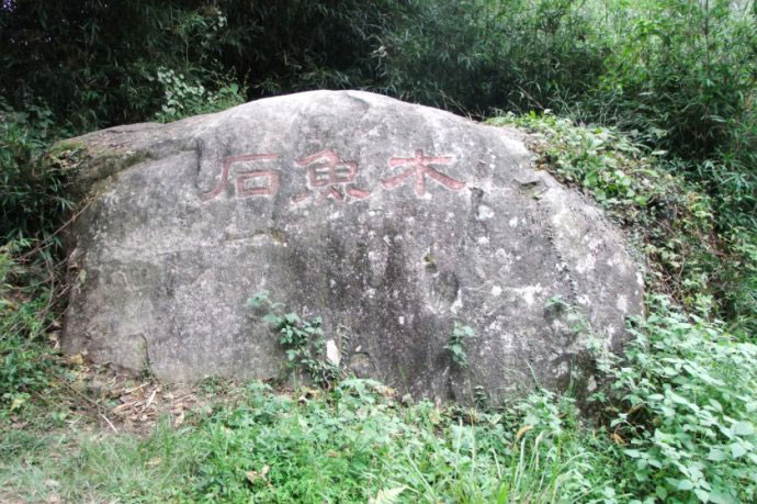 [木鱼石] 逢渠桥西南80米处,崖畔上有一块硕大的黑石,宽3.3米,高2.6米。一头高隆,一头低凹,以其形似木鱼,叩击顶端能发出剥剥"之声而得名。相传,良价在洞山广为接引学徒,使世人纷纷信奉佛教,这可激怒了铁拐李(属道教)。他来到洞山要见住持,但不巧良价正在讲经论禅,不可骚扰。于是铁拐李在殿外大声喊叫,要良价出来回话。吵闹声惊动了良价大师,一出殿就认出了来者,说:“原来是你这八百年的不死鬼!”铁拐李接口道:“那么你就是五百年的败家精,我要叫你今日就败”。他当即抛起铁拐,良价见拐杖化成一座山丘,直往头上压来,用佛指轻轻一弹,那么即被定降在寺院右侧,成了“拐棍山”有来无往非礼也,良价随手将木鱼掷了过去,铁拐李见状逃遁,木鱼落在离寺一箭之地,化成“木鱼石”。