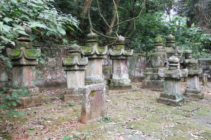 [红米埚塔林] 在洞山“古洞云深”坊左前500米左右的山头。建1741-1774年间。墓塔为蕴一禅师塔、直方来禅师塔、见月中禅师塔、雨庵澍禅师塔、墨亭海禅师塔、霁空明禅师塔。塔形相同,成一线整齐排列。塔后砌有罗围、中安墓碑,记述其生平业绩。塔林地墁石板,前有石柱。僧塔至今完好。塔林前另有僧墓14冢。