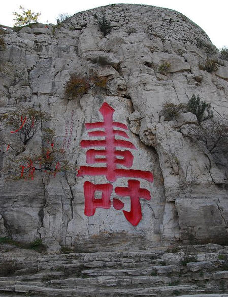 在云门山阴,有一海内罕见的巨大型摩崖石刻“寿”字,人称为“云门献寿”,系“大明嘉靖三十九年九月初九日,衡府内掌司冀阳周全写”。周全为衡王祝寿,以“寿比南山”之意而凿。周全为明嘉靖年间衡王府的内掌司(典膳系掌管王宫膳食的官),善作斗方之字,云门山留有他的许多作品。