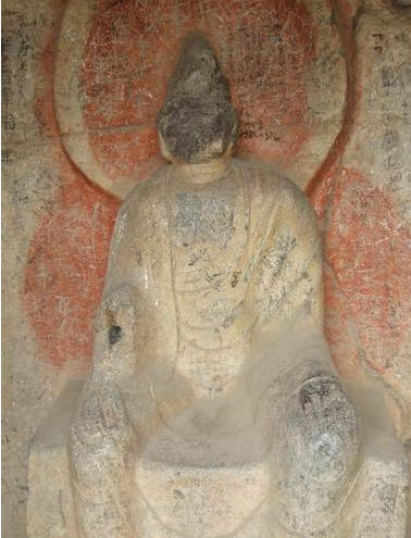 呈尖拱形,宽3.3米、高4米余,龛内造像为一佛二肋侍菩萨,惜主佛明代时被毁无存。大龛内及龛口部位共分布小龛24个,有隋唐题记多处。