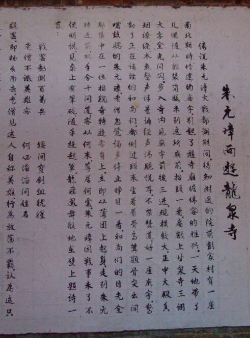 [ 注释 ] ①龙泉寺:故址在余干县古竹乡院前彭家村。始建于南梁天监二年( 504 ),后圮废。至南宋宝庆初(约 1226 ),该村进士彭震,以四川廉命名致仕返乡,倾囊重建,规格宏阔。元师南下,又毁。今已全毁。题壁:此诗原无题,今题为编释者所加。据该县乾隆进士段藻《龙泉寺碑》记载:昔明太祖征陈友谅时带剑独行至寺,僧异其状,频问姓名。不答,题诗于壁。……僧以为狂,取水洗去。他日太祖以仪从至,询诗。僧伏地吟 曰 :“御笔亲题不敢留,留下鬼泣与神愁。漫将法水轻轻洗,尚有余光射斗牛。”太祖释之。