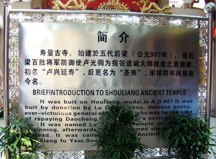 五代后梁百胜年防御使卢光稠,也是赣州市历史上任期最长的最高行政长官(任职32年),卢光稠因为阖宫疾疫所困,请名医,施良药,褥祠,占卜均无任何效果,于是请僧人道城,道诚圣手将其治愈,卢光稠十分感谢,欲以金银重谢,道诚微笑说:“得一袈裟地足矣”,也就是希望给他一立足的寺庙就足够了!豪爽的卢光稠立马捐赠他的东宅花园,并派人兴建寺庙,开始起名为“卢兴延寿”,后来改为“圣寿”,宋代祥符年间(1008—1016年)易名为寿量寺。