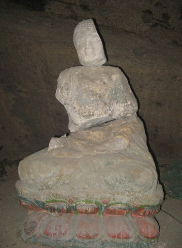 进入石佛洞,洞门仅容一人进入,里面光线很暗,过了一会我们才看清洞中景象。里面倒开阔,高约3米,大约5米见方,正面供奉着的如来佛、弥勒佛和药师佛三尊佛像,为后来所作。东边三个坐式石刻佛像那才是“真身”,三尊佛像高约1.2米,乃明弘治十一年(1498年),僧人觉安所供养,至今已有五百年的历史了。虽然遭到认为破坏,但是佛像主体尚存,非常珍贵。五百年,世事沧桑,山下沧海桑田,可这三位佛像依然静修着清净的岁月,安守着内心的一份安宁。