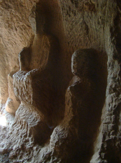 洞高约1.4米,宽0.8米,深6米。洞内北侧石壁有佛像2尊,均为坐像,东侧为一小和尚像,高约0.4米,双手合十,坐于蒲团之上。西侧佛像略高,高约0.7米。左手放于左膝之上,右手举起,头部略低,侧向东南,好像是在专心给小和尚讲经。面部均已损坏,残缺严重。南侧洞壁有佛像3尊,均为坐像,置于佛龛内,龛高约0.3米,佛像高0.25米,一尊损坏严重,无从辨识,另两尊面部被凿。此洞造像年代不详。