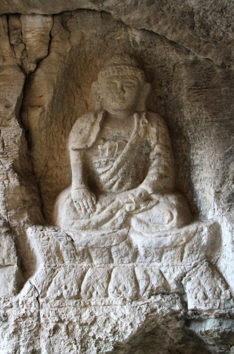 南壁佛像结跏跌坐在座台之上,造像通高1.9米,座高0.6米,头戴唐僧帽,双耳齐肩,身披袈裟,双手食指并拢,其余手指呈抱拳状。北壁为释迦牟尼像,身披袈裟,结跏坐于莲花座上,通高1.28米,座高0.48米。肉髻、螺发、双耳垂肩,双目微闭,左手横置在足上,名为“定印”,表示禅定的意思。右手直伸下垂,名为“触地印”,表示释迦在成道以前的过去生中,为了众生牺牲了自己的一切,这些唯有大地能够证明,因为这些都是在大地上做的事。这种姿势的造像,名为成道相。