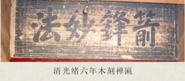 这块禅匾长约3米,宽约1米,牌匾当中雕刻行书“箭锋妙法”四个大字,遒劲有力,饱满厚实;牌匾提头:“兄大和尚系昌江菩提种也,同治酉冬义宁仁乡六十五都众檀护并同门敦进住。黄龙方丈戴第由是时亲道范饫,真凡睹其动静语默无不合乎,佛祖规恍如马鸣龙树重出于世,弟因不命揣小徒。”落款为“少修南膜莲座领受正法眼藏希异作半汉也兹逢,法兄旋锡友赐此‘箭锋妙法’四字以谢摩顶授记之意云。光绪六年孟春月秉拂古罗柏方丈退隐”等字。