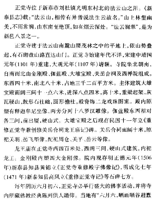 新泰市文物普查队在刘杜镇进行田野普查时,发现了正觉寺宋代题刻。 正觉寺位于刘杜镇光明东村北法云山半山腰,法云山素为新泰名区,“法云翠润”为新泰古八景之一。据光绪《新泰县志》载,正觉寺创建于北宋建中靖国元年(1101年),金、元、明、清历代重修。寺庙东西65米,南北73米,建筑面积5500余平方米。座北面南,依山势而建,二进院落,合院式,中轴线式建筑布局,由山门、大雄宝殿、东西配殿、关岳合祠等组成。