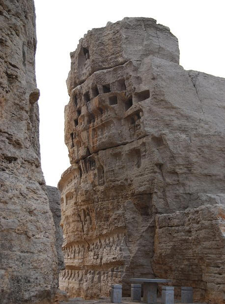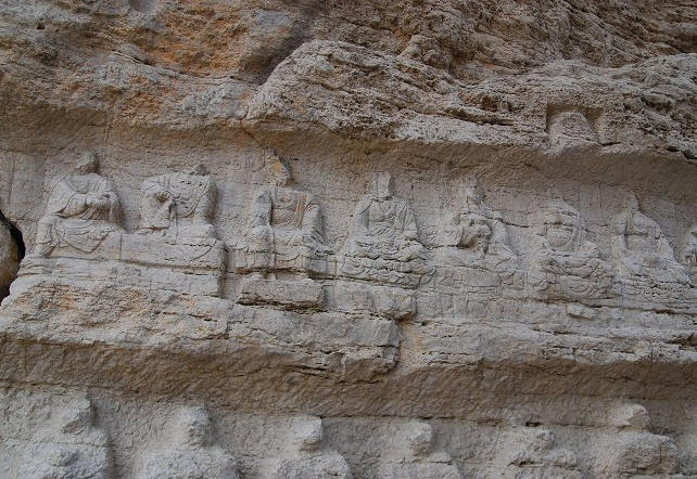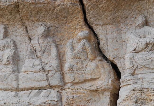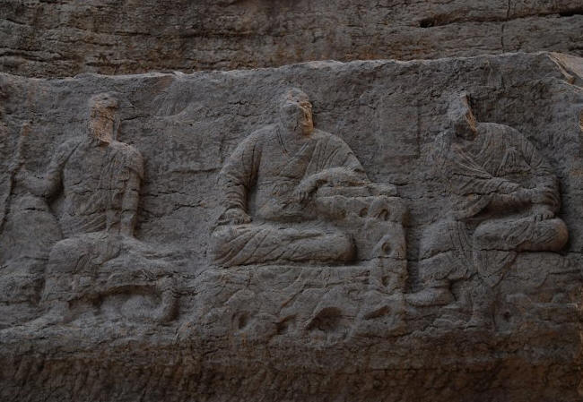 南崖风蚀比较严重,多为唐宋时期的单体佛像和罗汉像。山东面有一处刻经,南北长12米,高2米。所刻为《佛说大般涅架经》,字径16厘米。棘梁 山摩崖造像时间延续久,•内容丰富,不仅有佛教造像、刻经,还有一定道教、儒教造像,但不占主流。其中东崖南面下端有宋代“三教通连龛像”,“释加牟尼” 佛居中,“文宣王”孔子居西,“老子”居东,每尊主像左右又各立‘—弟子像。,