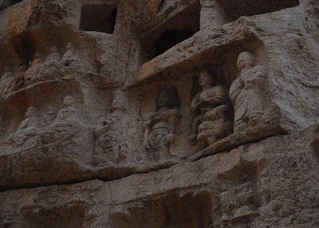 西崖多唐、宋造像,有一佛二菩萨、一佛二弟子二天王二力士等组合像,其中唐代造像多为武周时期佛教石刻造像,均展示出唐代成熟期的造像特点。造 像多通体磨光,面相方圆丰满,有的颈饰蚕节纹且眉间有突起白毫相,发髻有螺髻、涡髻、高内髻等,着通肩式衣或双领下垂式衣。座多圆形束腰仰莲座。造像神情 丰富、雕刻精细,五官比例适度,几乎近于真人形象,表现出鲜明的时代特点,更体现出了佛教造像的演变规律。其中的36罗汉造像更是神态各异,持物不同,栩 栩如生,其上端的十神王像更县特色。东南最上端尖拱形龛内有一佛二弟。子像,佛像体稍前倾,目光俯视,双手全合十,似在注视着世间的沧桑,