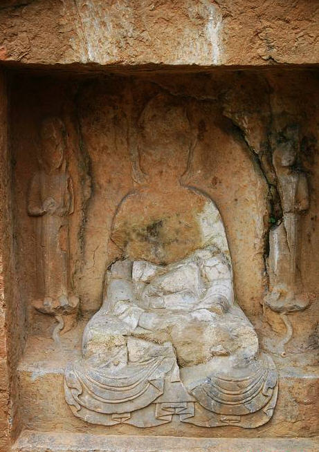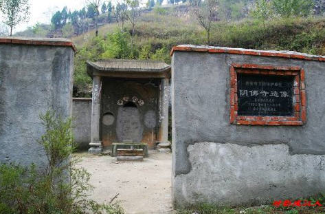 阴佛寺石窟造像 阴佛寺石窟造像位于泰山南麓泰安市郊区角峪镇玉皇山南坡峭壁上,属晚唐石 窟造像。横长方形、弧顶龛形窟,内有高浮雕释迦牟尼佛1尊,坐像,螺髻,双耳 下垂,表情和蔼慈祥,内著僧祗支,外披袈裟,作施无畏印(已残缺)和与愿印;双 膝下垂,跣足踩莲座。有唐咸通十四年(873年)题记1则。龛外峭壁上有数尊小佛坐像。