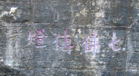 碑后的山崖上刻有“七佛传灯”四个大字,每字0.2米见方,正楷体阴刻,落款为“崇祯丙子上元清和郑位题”。历代文人墨客多临寺游览赋诗,清咸丰壬子 (公元1852年) 科进士工部屯田司主事尹汇瀛诗云:“青霄突兀起危楼,壁嶂嵯峨最上头。终古灯光留七佛,于今庙貌壮千秋。遥分海岱雄齐境,近接陶牛控泰州。肥子城西石横镇,茫茫泌水绕村流。”