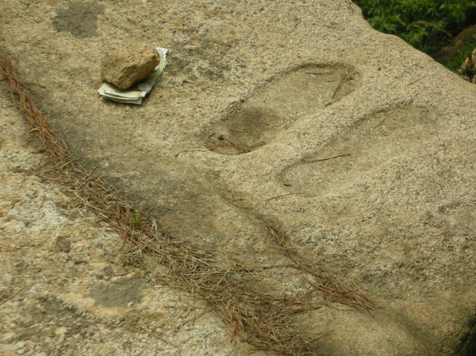西佛脚是一对平行的脚印,印于悬崖之上不足一平米的石坪上,陷进岩石两三厘米。