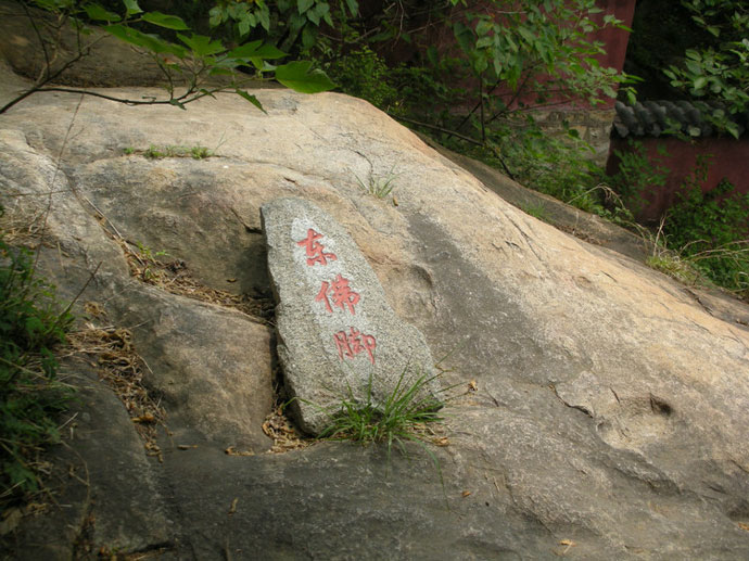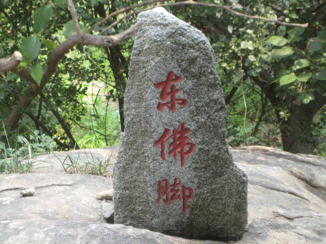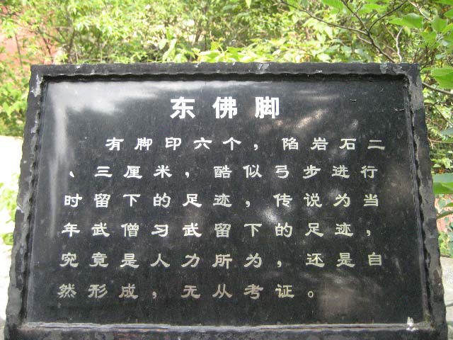 东佛脚在大雄宝殿到一亩松路上的石坪上,有脚印六个,陷进岩石二、三厘米,酷似弓步时留下的足迹。