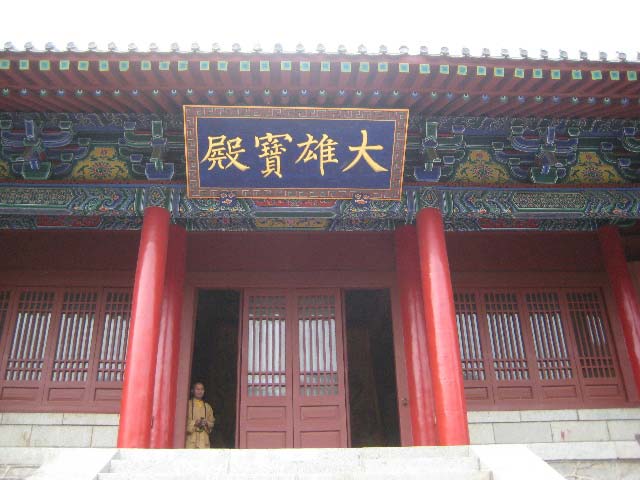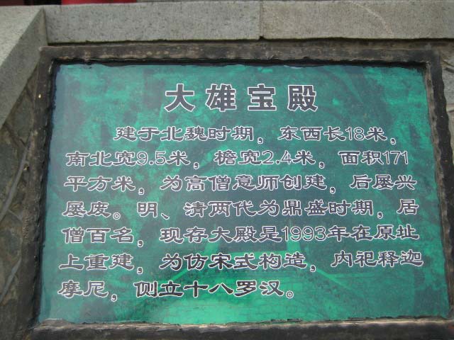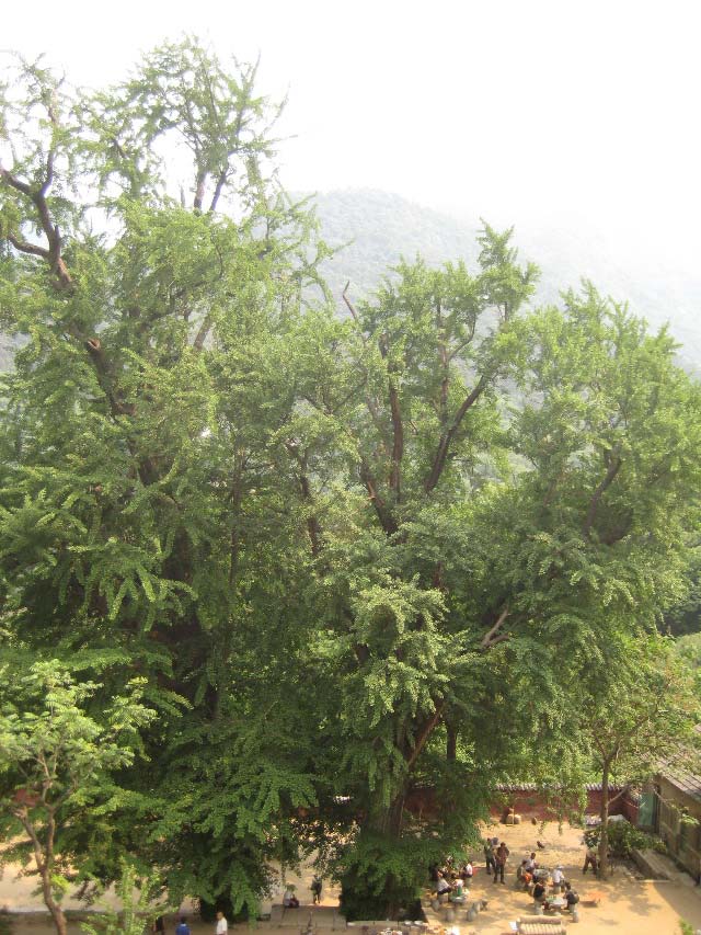从银杏树间拾阶而上,抬头可见高台之上的大雄宝殿。两棵银杏的位置如此恰当,就像四合院里的影壁墙,不绕过影壁墙,你看不到正房。而当你为影壁墙赞叹的时候,巍峨辉煌的大殿再次让你张大了嘴巴。只有佛祖能当得起这1300多岁的绿屏风;只有佛祖能在这并不宽敞的玉泉寺不显得委屈,反而彰显出一份庄重与神秘。大殿像一把太师椅稳坐群山怀中,显得雄而可亲;并不高耸的谷山,因大殿的衬托增添了几分威严。周围的山峰、丛林环绕宝殿,建筑与环境天衣无缝;自然与人工浑然天成,也许,这就是“禅”!