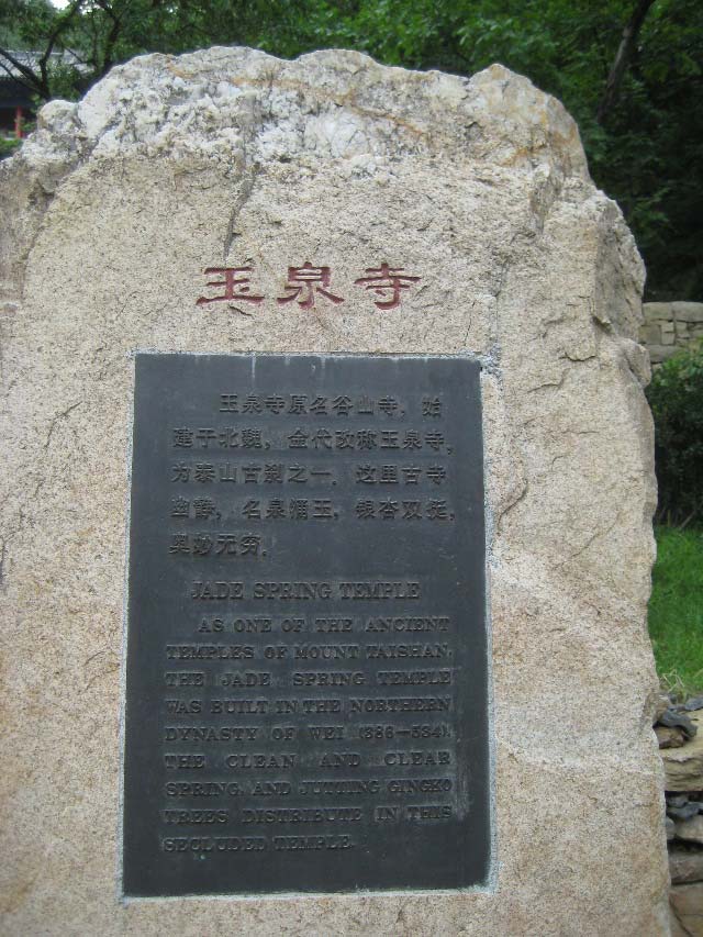 踱入山门,最吸引您眼球的是两棵硕大的银杏树。两株银杏高约40米,树围需4人环抱,枝干粗壮,树叶繁茂。看介绍,树龄已有1300多年,为泰山银杏之最。西面银杏树下有《重修谷山寺记碑》,记叙了在此建庙的条件和历代高僧修建寺庙的艰苦历程。碑文依然清晰可读。包括这两棵“银杏王”,玉泉寺内共有4株银杏树,全部为雌株。您到玉泉寺游玩,如果有兴趣的话,可以找找其他那两株。