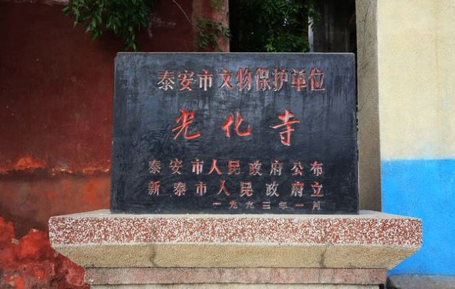 光化寺位于徂徕山蓝溪之阳,山坳之中,左右两山拥抱,南望诸山,如翠屏叠嶂。该寺创建于后魏,有山门、配殿及大雄宝殿,大雄宝殿主奉如来佛祖,殿内绘明、清代的两层壁画,色彩绚丽,人物形象生动,把佛教故事渲染得惟妙惟肖。寺内有古松、古柏各一株,树龄均在千余年以上。柏名"三义柏",一本三株,气宇轩昂,叶色浓翠,整齐如结义三兄弟。古松名"凤松",似丹凤展翅,起舞弄姿,浓荫匝地,冠盖亩余。
