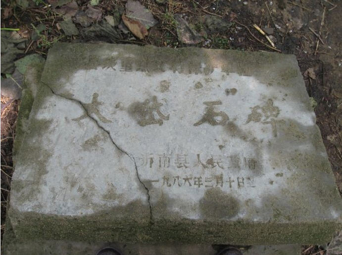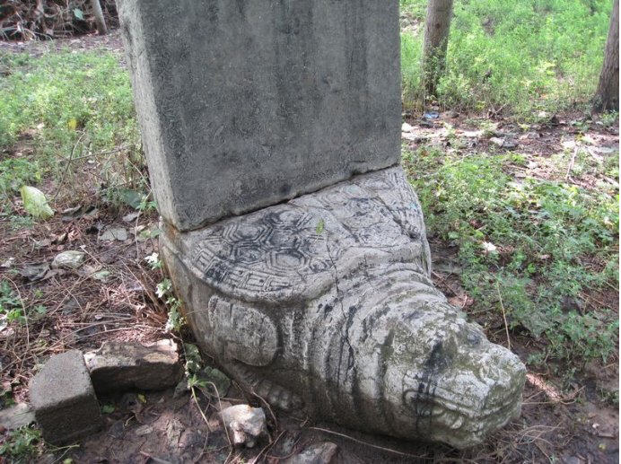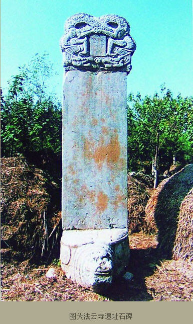 东面的大门外有多通石碑,仅存两通(见上图),分别为明朝嘉靖九年(1530)和清咸丰元年(1851)重修法云寺时所立。明嘉靖九年《重修法云寺记》碑为县级保护文物,通高三点五五米,下为赑屃碑座,头东尾西,中为碑身,上边为碑帽,两面皆是二龙戏珠浮雕。中间有“重修法云寺记”六字,碑身正面为明嘉靖九年重修法云寺碑文,其内容主要有三:一是说明佛教的兴起已很久远,寺庙兴建时间也很久;二是叙述僧人佛泰的资历和建庙经过及功绩;三是叙述重修法云寺原因及时间。背面为宗派图和施主姓名,碑身已裂向南倾斜,有些字迹已漫患不清。