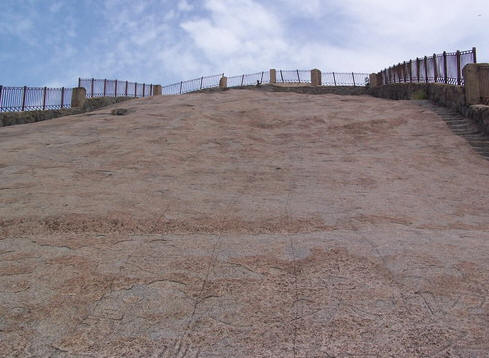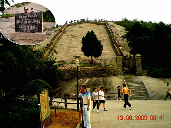 在邹城北郊铁山公园内西侧,海拔146米的铁山之阳的一斜坡为45度的巨大花岗岩石坪上,刻有大字数行,即为铁山摩崖刻经。