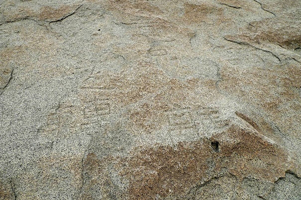 题名,在刻经的下部,原共10行,行9字或3字不等,共66字,字径40厘米,字行间有阴刻界格。现仅存6行44字,内容记载了经主及佛经书写者姓名。第6行刻有“东岭僧安道壹署经”的词句,当系安道壹为铁山刻经的题名。《题名》书风较经文略显瘦硬寒峻,结体严谨,冷隽绝俗,富有山林野壑之气。另据《山左金石志》、《山东通志》载,《题名》附近还刻有“安上”、“鄣离”、“佛善”、“实性善男子菩萨”四种刻字,何义,无考。
