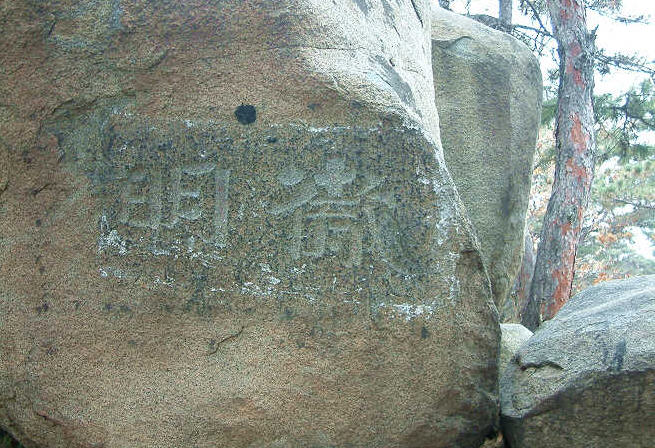 散刻大字《入楞伽经》,散刻于从山下到山上32处岩石或山崖石壁上。刻在崖壁上的经文排列整齐,有清晰界格,字径一般40厘米左右。已释读联缀出128字,经文首尾相接,尚缺27字有待查找。字体楷隶相间,笔锋外露,奇谲瑰丽,气势雄厚。刻经内容描绘了佛国净土的景况,并赞颂了岗山优雅舒美的自然环境。