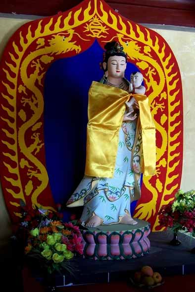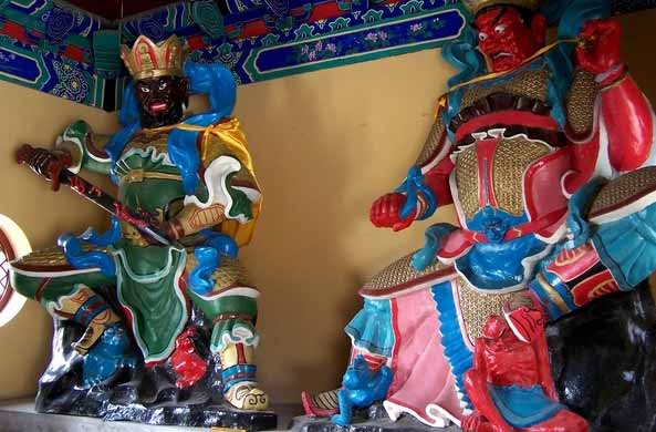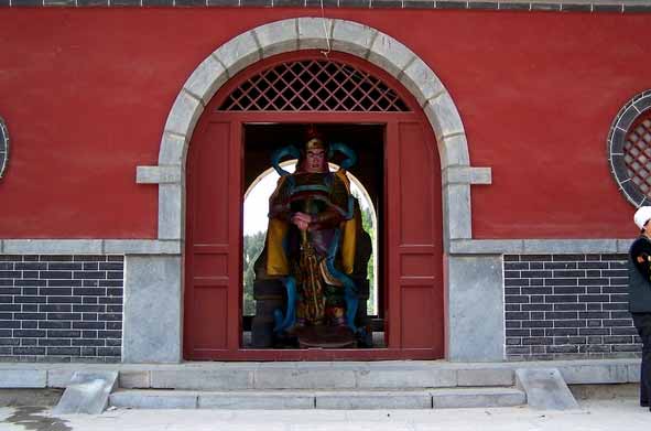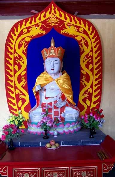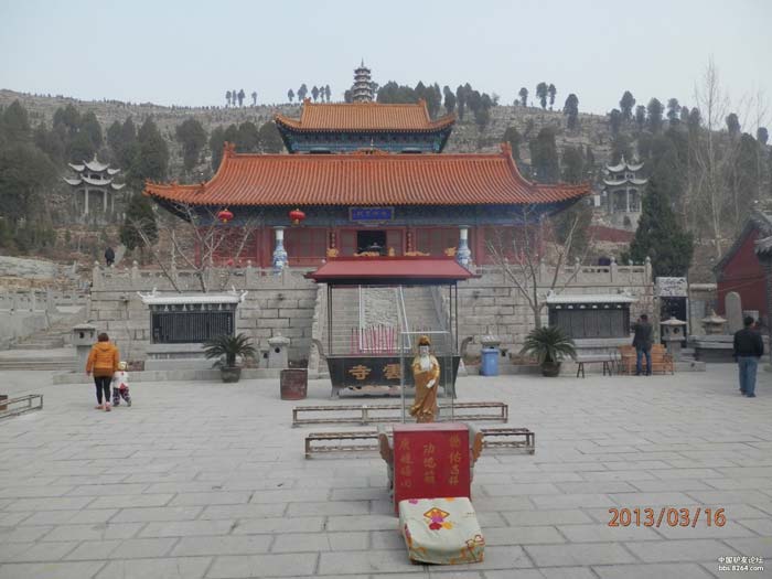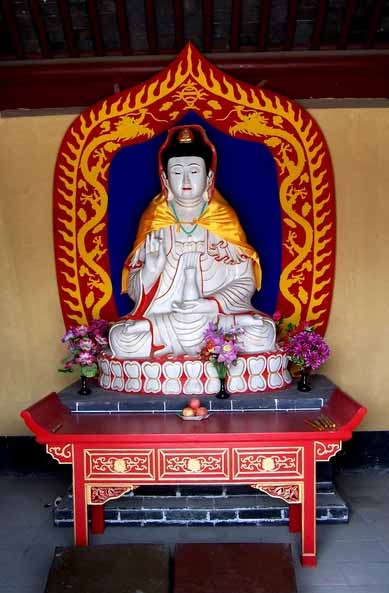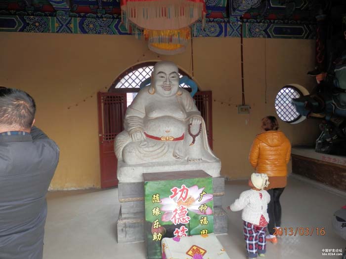 拾级踏步,在山门内正面坐着弥勒佛,两旁是四大天王。来到大雄宝殿,殿前香炉内有“平安如意香”、“登科富贵香”、“父母长寿香”等等不一而足,各种各样的香火不断,进得殿来,正中是释加牟尼像,左侧是消灾延寿药师佛,右侧是西方极乐世界阿弥陀佛,“三圣佛”全部是用缅甸玉雕成,精细而庄严,神态各异,栩栩如生。每樽玉像高达3.2米,重10余吨,大殿后壁是观世音菩萨,周围是姿态各异的18罗汉。老人和孩子按照他们的意愿烧了香、磕了头。然后转到“三圣佛”的后面,向观世音菩萨虔诚的磕头,并在心中祈祷。出得殿门,向右转,有甘露泉,泉水清澈如镜,终年不息。一些游人携壶带桶,以饮品玉泉而生“祛病延寿”之趣,而长年在此的工作人员和附近的农户,四季以泉为井常年饮用。泉旁有一口井,据传电视剧《济公传》里有一个济公和尚从井里拔木料的镜头,或许就是以法云寺流传了一千多年的传说为底本而拍制成的吧!