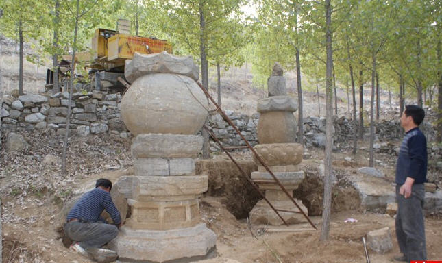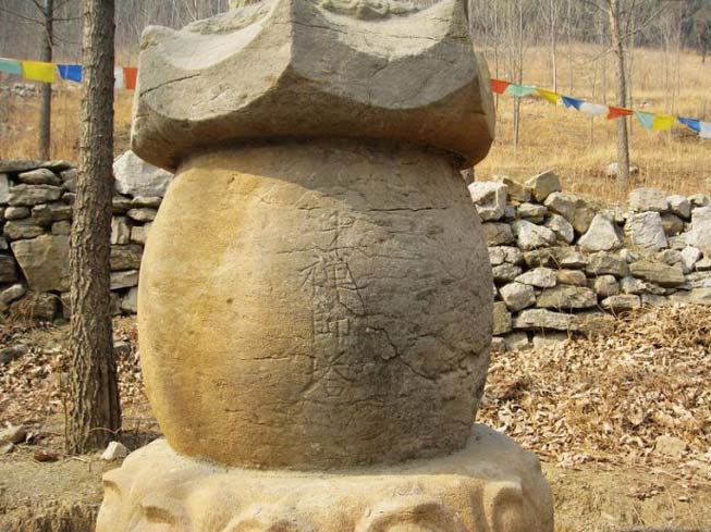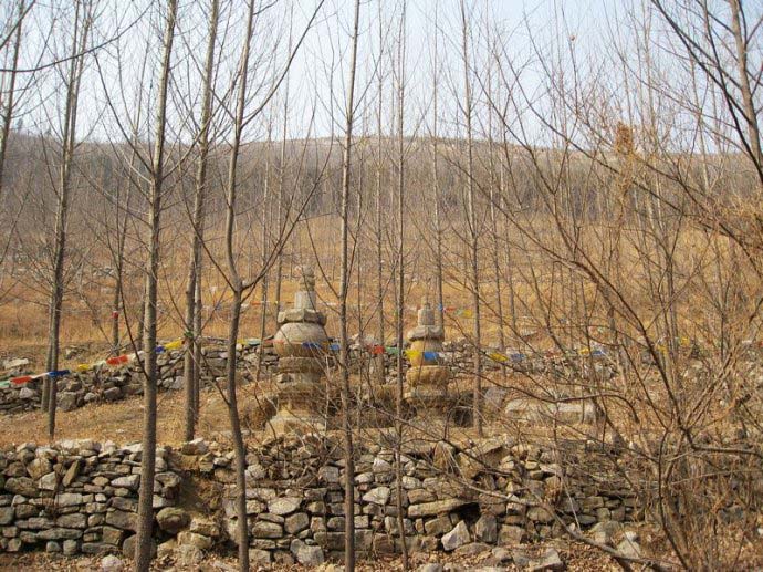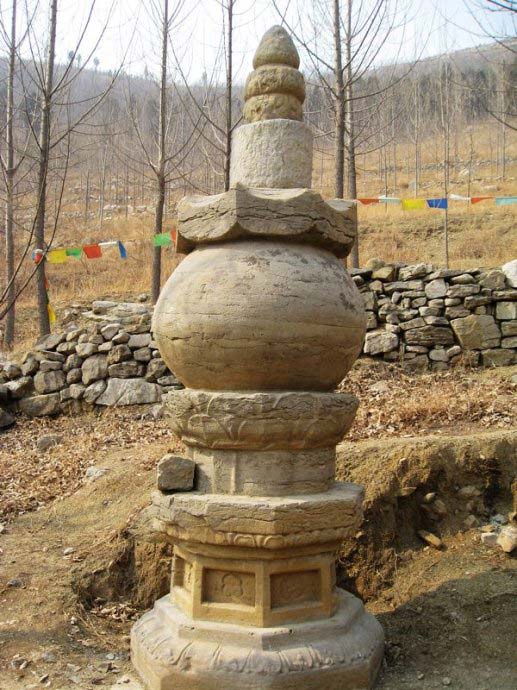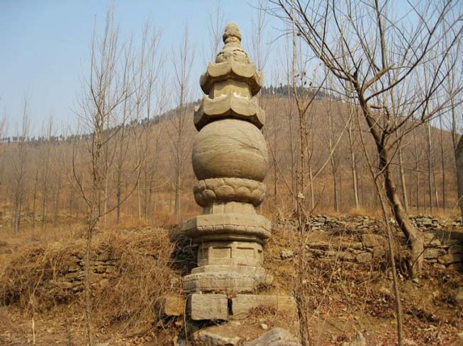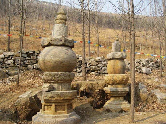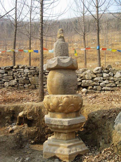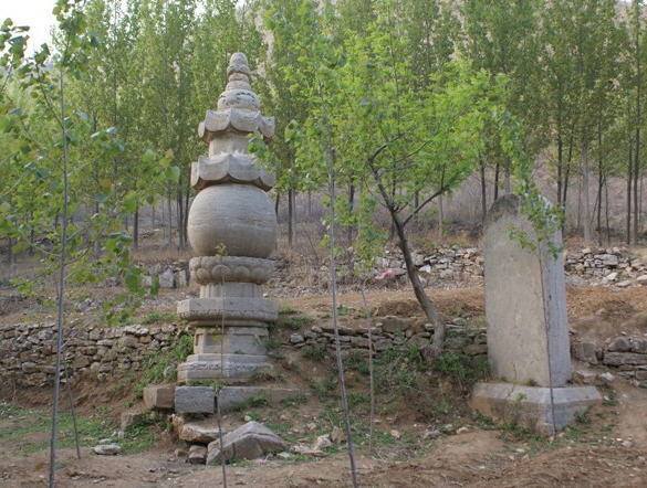 古寺历代高僧皆葬于寺西南山坳,石塔林立已成往事,战火、文革使其仅存其一。然塔尖一米有余已被盗,塔身高三米余。塔为石结构,塔身自上而下,第一层为四方石,第二层为莲花宝座,第三层为六角石,第四层为莲花石,第五层为雕龙石盆,第六层为石鼓,上有三字因年代久远漫漶不清,第七层为上翘八角石,第八层为上翘八角石,第九层为秃圆形莲花石塔帽。在该塔东边有一石碑,塔旁石碑厚一尺,高六尺,碑刻“故廉禅师塔铭”六字,其详细内容因风雨侵蚀字迹难辨。碑经考证,该塔始建于明代,历代重修碑均破坏,清同治年间毁于大火。该塔前几年被人推倒,其内藏高僧舍利石函已经被洗劫一空,后经上照下空法师发愿重修,大众支持,该塔于农历二○○九年九月九日寻回失散塔石,重新立起。其余诸塔或毁于战火,或毁于文革,残躯遍地,地堰多有,其一文曰“七十二代主持”。