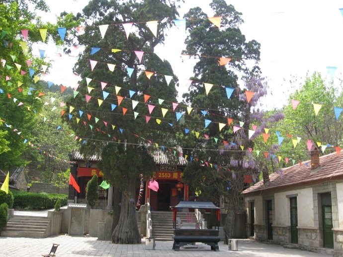 一跨进院门,一面迎门墙当中而立,白底黑字,正面一个大大的“佛”字,背面一个大大的“禅”,一下子就把人带入了佛教世界。右首侧一座钟楼,左首侧一座鼓楼,钟楼内的大铁钟高两米,重达1吨多,铸有八卦符号,系金大定二十八年(1188年)由泰安州莱芜县铁冶务匠人王岂等人所铸造。至今钟声清脆嘹亮,声震山谷,回响不断。晨钟暮鼓,迎来送往,千载未改。绕过迎门墙,坐西面东的是一座雄伟的大雄宝殿,大殿青砖黛瓦、朱门粉墙,大殿内外画栋雕梁,古朴庄重,典型的寺院建筑。殿内供奉如来佛祖、观音、十八罗汉的塑像,神采各异、栩栩如生。大殿前和院子内外散布着古柏、古槐、古银杏等共计14棵,其中古槐3棵,古柏5棵,古银杏3棵,始植于汉宋时期,树龄最长的已达2000年以上,有几人合抱粗,虽历千年风雨,仍枝繁叶茂,根系发达,生机盎然。现在寺内的古树群和古钟为蒙阴县重点文物保护单位。