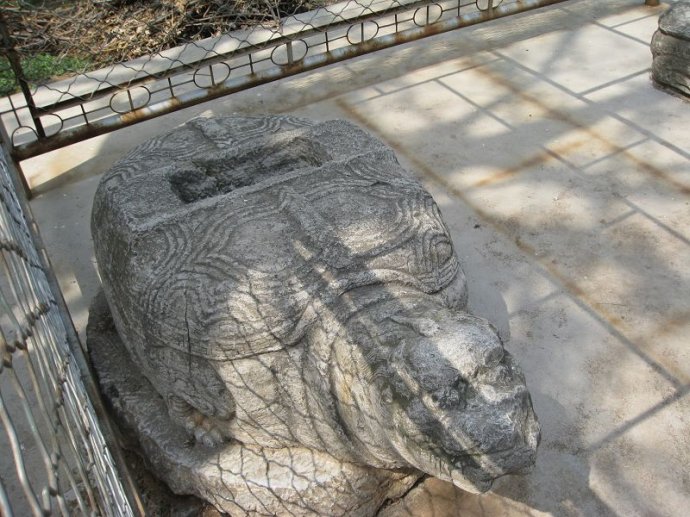 寺北墙后有一棵古槐,槐下存有两个赑屃(驮碑的石龟),系石碑的基座,但如今龟背上的石碑早已不知去向。此两件古“龟砣碑”系高浮雕,均刻于巨型石灰岩上,石莲花座,保存完整。据说寺院西北侧原有两块镶嵌在墙壁上的碣石,那是宋真宗赵恒的“御制栖真亭响石”诗碑。关于响石,《山东通志》和《沂州府志》均有记载,中山寺“其石颇巨,空透玲珑,击之声韵清远”。宋乾兴年间(1022—1031年)下诏构筑栖真亭于响石之上,有宋真宗御制《栖真亭响石诗》石碑。据康熙二十四年版《蒙阴县志》记载:“白居易,号乐天。尝游中山寺,徘徊不去,栖息数月,吟咏颇多,今只有七言一律刻响石上。”如今响石无存,御碑亦不知去向,仅存驼碑的石龟空有负重之术,兀自静卧。石龟那精美的造型与纹饰昭示了昔日整幢石碑的精巧与华丽。