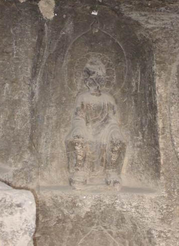 为中型窟,刻一佛二侍立菩萨像,主尊结跏趺坐,面庞呈椭圆型,五官残缺,后有圆型头光。内饰莲花。主尊内着僧祗支,外穿褒衣博带袈裟,手施无畏与愿印。衣纹比较简洁流畅。两胁侍菩萨面部残缺,头戴高冠,宝缯飘然下垂,颈饰项圈;身材修长而富有曲线变化;其服饰华丽,身着披帛,长裙曳地,外饰精美的璎珞。此窟虽没有明确纪年,但从造像风格和雕刻手法来看,与龙兴寺遗址出土的隋代造像极为相似,故应为隋代的遗物。