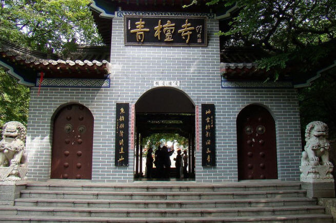 该寺是冠世榴园风景区自东向西的第一个旅游景点,俗称“青檀秋色”,为古峰县八景之一。据《峰县志》记载,唐朝以前名“云峰寺”。唐时青檀树遍植山谷,遮天蔽日,故改名为“青檀寺”。从唐代到宋、元时期,寺庙香火日盛,谷中置寺庙多处,故有僧屋如巢之说。到明、清时期,此地为文人墨客,达官贵人游玩胜地。清末民初,寺毁于兵火。现青檀寺为1985年重建。门坊为三门四柱双垂飞檐斗拱,木质结构与钢筋水泥混合结构的仿古建筑。门上方一黑色大理石镶嵌横匾,题“青檀秋色”四字,为浙江省副省长刘亦夫书。门坊内是长约1.5公里的狭谷,谷内树龄在千年以上青檀树有36棵,百年树龄的不计其数。狭谷尽头即为青檀寺。庙门匾额“青檀寺”三个字,为书法家舒同手笔。寺院占地面积1050平方米,建筑面积330平方米。主体建筑为大雄宝殿五间,飞檐斗拱,殿内供奉三世佛。殿前院内有一株银杏树,树龄逾千年,至今干壮叶茂。殿前有一龙窑泉,水从大殿基地流出。西有三间配房,东有长亭。亭旁的东山岩壁上有文峰山人题写的摩崖石刻“忘归”、“龙”二处。大殿后石壁上刻有“还我河山”四个大字,上有岳飞养眼楼,相传宋代民族英雄岳飞因患眼疾曾在此养病,宋时建楼纪念,毁于“文化大革命”时期。1985年重建,建筑面积为112平方米,楼内塑有岳飞坐像。