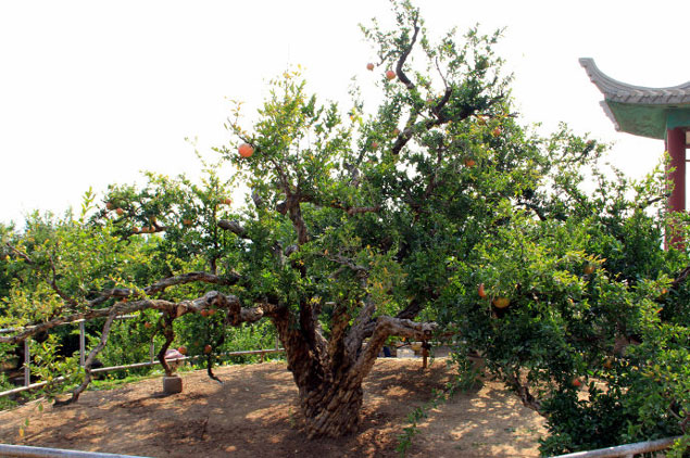 这棵石榴王已经500多岁了,仍然硕果累累。因为榴园依山傍水,榴树造型奇特古朴,且花木枝叶俱美,形成了四季皆宜观赏的景观,犹如打开了一幅风情画卷。在这棵树王前照相农民要收5元钱,现在农民也很有经济头脑了,好事也。