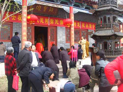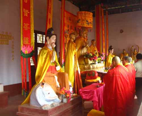 出天王殿后门上一石阶梯,即可去大雄宝殿。在大雄宝殿门前也有一只香炉,高约3米,造型美观。大雄宝殿内正座者为释迦牟尼,南侧为侍者阿难和骑象普贤菩萨;北侧为侍者迦叶和骑狮文殊菩萨。在大厅的南北以及后部为16尊者。