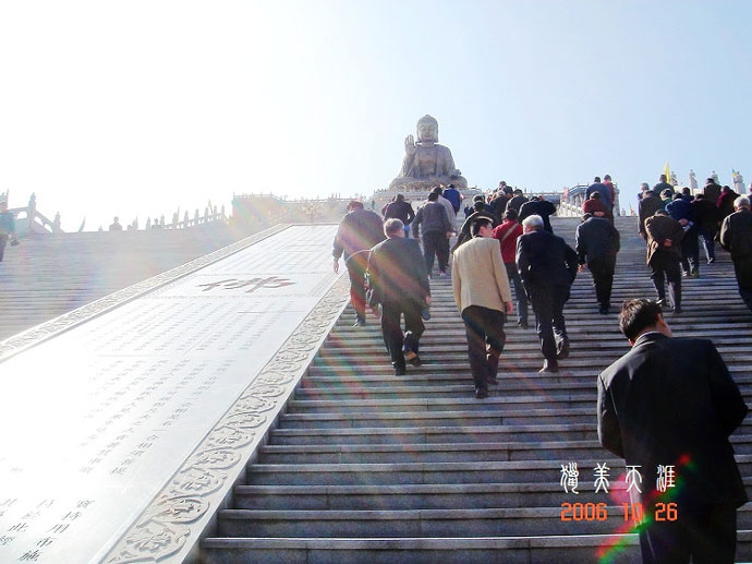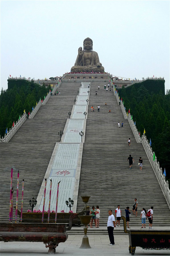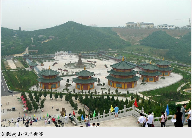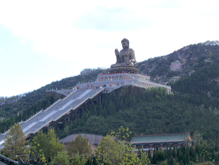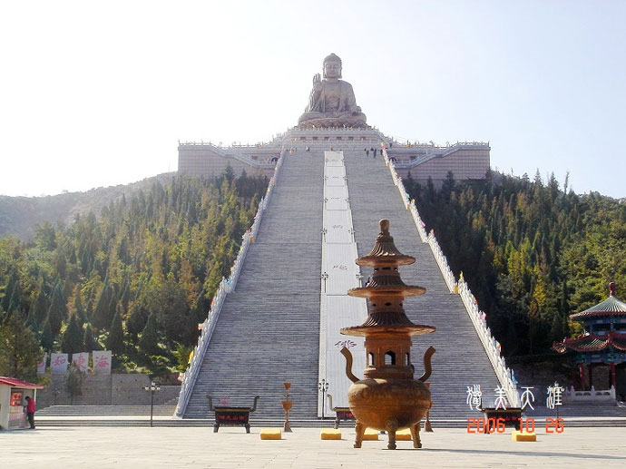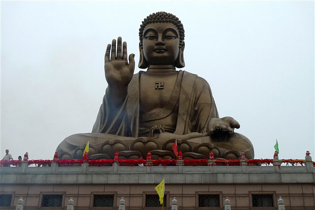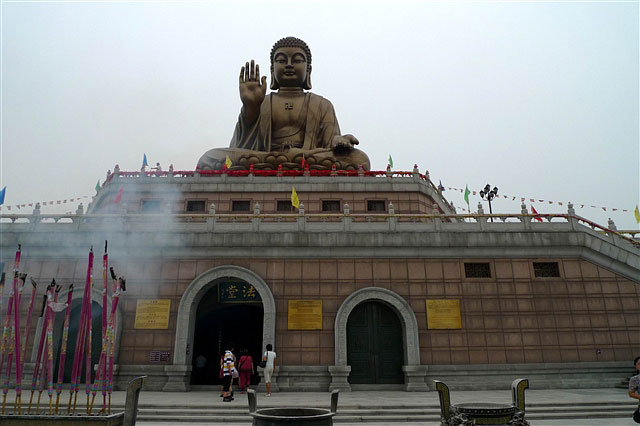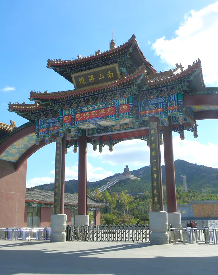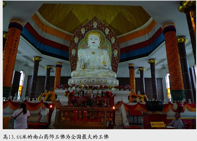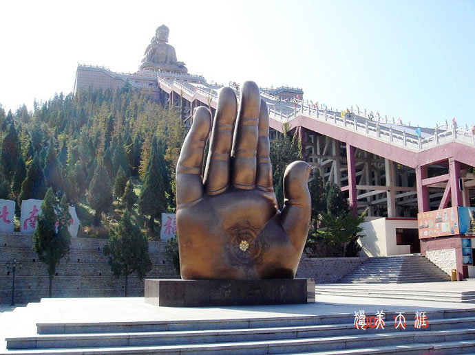 南山大佛释迦牟坐佛造像,选材锡青铜铸造,大佛高38.66米,重380吨。由232件佛体、108块莲花瓣、302个发髻、共642块,锡青铜铸件组合而成,堪称目前世界第一大铜铸佛。莲花座下建有功德堂、万佛殿和佛教历史博物馆。南山大佛熔古今中外佛像铸造艺术的精华,使古老的青铜铸造艺术和现代科技成果于一体,展现了佛教文化和现代文明的完美结合。