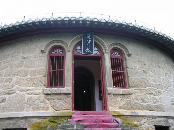 位于狮子峰的尾部。建于二十年代中期,所建动机无可查考,依其形态,外观粗壮,呈伞状,叫圆佛殿。原为五门,每门内塑一尊佛像,故亦称五佛殿,后佛像被毁改门成窗。整个建筑显得平稳舒展,落落大方。然而,里面结构却不象是个佛殿,因为当中垒一根实心石柱:直通殿顶,造型独特,象征什么?民间流行这样的说法:此殿是唐生智所修,动机是为母亲择葬风水,看中了狮子峰。因为头部有天池寺,背部有天池塔,剩下尾部并无建筑,只好定于此处。这小建筑,历时六年才予修成,自然引人注意。大概,其中含有这样隐情:唐母吃斋念佛,待坐化后骨灰暗葬殿地正中之故。上面当中立根石柱,以表示狮子峰尾的狮子尾巴。