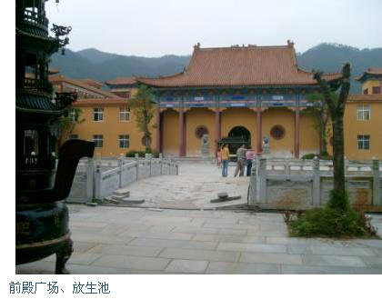 莲池:穿过殿宇,进入西侧,这里就是“莲池”。你看,龙安山东麓群峰隐现,犹如一朵莲花。散开的九个花瓣,莲池即座落在“莲蕊”。莲池面积2000余平方米,池堤前面是 莲花广场,观音菩萨高17米,持莲而立,迎接四方游客。