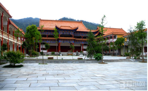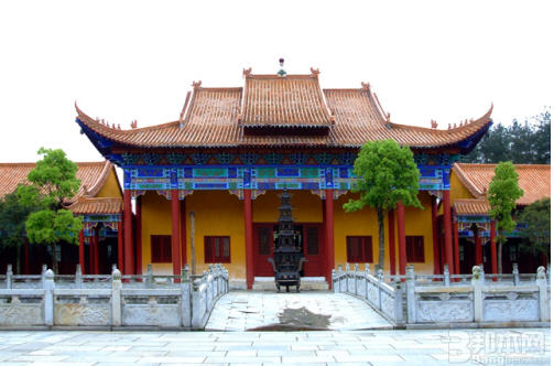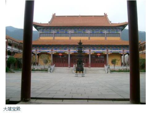 大雄宝殿:穿过天王殿,展现在眼前的这座雄伟的大殿,是大雄宝殿。大雄宝殿为仿宋歇山顶式,造型宏伟,金碧辉煌,殿高30米,占地2000平方米。殿前台阶中央为“九龙伴日”是一副珍贵的石雕工艺品,殿内供奉的是横三世佛,中间供养的是婆娑世界教主释迦牟尼,右边供奉的是西方极乐世界教主阿弥陀佛,左边供奉的是东方琉璃世界教主药师佛,在佛的胸间,有“卐”的标志,这是武则天给的定义,意为太阳光芒四射或燃烧的火。后来作为佛教吉祥的标记,以示吉祥万德。大殿东西两侧供奉的是十八罗汉。释迦牟尼背后供奉的是千手千眼观世音菩萨。在观音左前方,是文殊菩萨,专司智慧,手持宝剑,身骑狮子,象征智慧威猛,人称大智菩萨。在观音右前方,是专司理德的普贤菩萨,手持如意棒,身骑六牙大象(表示六魔),人称大行菩萨。