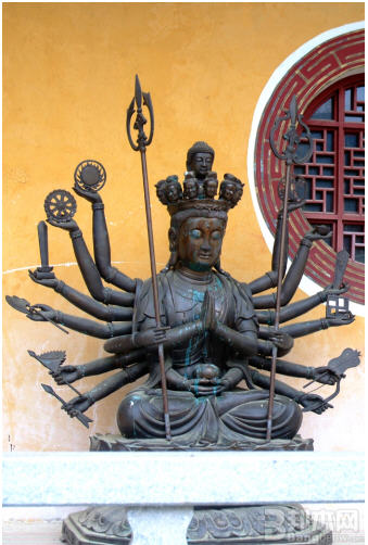 天王殿:我们现在到了天王殿,殿中间供奉的是天冠弥勒佛,他笑口常开,迎接着善男善女,两边供奉的是各护一方天下的四大天王,分别是手握宝剑的南方增长天王,掌管风;手持琵琶的东方持国天王,掌管调;手持宝伞的北方多闻天王,掌管雨;手中缠龙的西方广目天王掌管顺。四大天王就是掌管风调雨顺,五谷丰登,护国安民的天神。在弥勒佛背面,是手持金刚杵的韦陀菩萨,他原为南方增长天王,手下神将。韦陀曾亲受佛祖法旨,统管东、西、南三洲巡游护法事宜,保护出家人,护持佛法,故称三洲感应。相传释迦牟尼涅磐后,帝释天手持七宝瓶准备取下佛牙舍利回去建塔供养,时有罗刹鬼躲在释天身后,趁人不备突然窃去佛牙,韦陀奋不顾身,急起直追,刹那间把罗刹鬼抓获,并夺回佛牙舍利,后被尊称为菩萨。