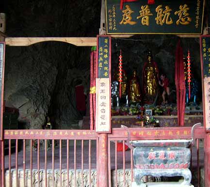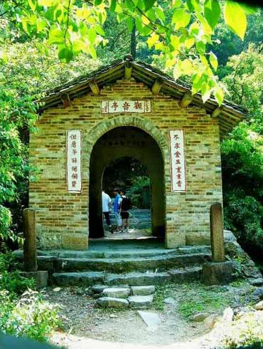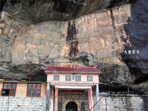 大觉岩属天然石室,“岩形若檐上复”,下辟一门,平展如削。岩洞前高后低,深约30米,宽约60米,高约9米,宽敞明亮可容纳2000余人。岩前绝壁悬挂,古木覆盖顶端,气势十分雄伟。大觉岩的来历有一个优美的传说。相传古时候有九只狮子来到大觉岩,看到这里风景绝佳,就在这里住了下来,不久它们把周围的野兽都吃光了,再呆下去就要饿肚子,于是就商议留下一只狮子,其余的都离开。但是,九只狮子没有一只愿离开这儿,于是它们发生争吵,继而厮打起来,力气小的不是被打死,就是逃亡他方,最后只剩下一雌一雄两只狮子,旗鼓相当,相争不下,一直斗了七七四十九天,最后雄狮子被打败了,而母狮也累得张着大嘴喘气。喘着喘着,它身子变硬了,变成一座大山,身上的毛变成了满山树木,翘起的尾巴变成了岩旁的大石笋,张大的嘴巴变成了狮子岩。