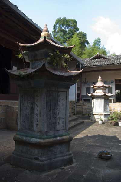 前面讲到,宝方禅寺後侧有「母女」塔一座。该塔高达三米多,颇为壮观。它有何来历呢?原来,在明末崇祯年间,有邓门涂氏女,青年丧偶,遂携女皈依佛门,随带租田三十担入寺,朝暮顶礼参禅。其母法名「心悟」,其女法名「琪文」。琪文於顺治五年(一六四八年)示寂,心悟则於康熙十四年(一六七五年)圆寂。後来,邓姓宗戚敬其母女参禅心坚,逐义建「母女」塔一座,将其母女骨灰安放塔内。