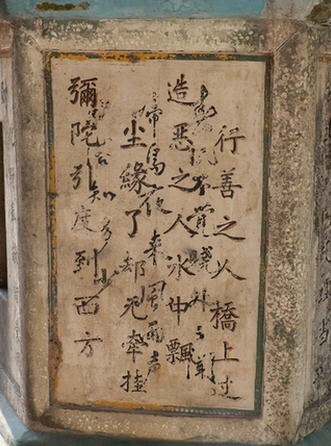 上蓝院自盛唐建成后,传了数代,几成废墟。后有住持僧德稠和徒文善,共发奋诚募,遂得江夏黄道珍居士与妻郑氏、安定梁德城居士与妻陈氏等鼎力相助,建正殿一座,装塑释迦牟尼及左右护卫等佛像九尊,重装罗汉堂、观音堂各一座,使上蓝院面貌一新。