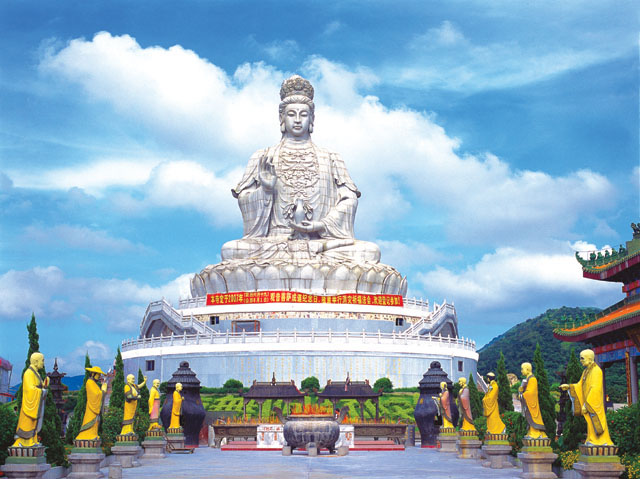 观音山国家森林公园建成时,择极具灵气的花岗岩,靠人工雕琢,历时三载,终请成净高三十三米、重达三千多吨的世界最大花岗岩观世音菩萨圣像。圣像雄踞观音山顶,端坐须弥莲座之上,头戴宝冠,身着天衣,肩披帔帛,胸饰璎珞,左手持净瓶,右手结无畏金刚印,古朴典雅,栩栩如生,是不可多得的极具盛唐风采的石雕艺术精品。目前,观音寺已初现百年前古寺景象,大悲殿、财神殿、古鼓楼、古钟楼等已建成,于观音山间小径漫步,经常可以遇到身穿袈裟的僧人,美丽的自然风光和浓郁的佛境气氛,使它蒙上一层神秘的色彩。