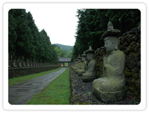您见过全身乌黑、浑身布满密密麻麻小孔的佛像吗?如果前去济州观音寺,刚跨入一柱门就会令您不由自主地睁大双眼。从一柱门经不二门直至大雄殿,道路两旁整齐地排列着阿弥陀佛、比卢遮那佛、释迦牟尼佛、药师如来佛等一尊尊黑色的佛像,就像进入了佛像隧道一样,场面非常壮观。这些佛像是用黑色的玄武岩雕凿而成,熔岩在喷出时被海水瞬间冷却而形成了许多气孔,因此用玄武岩雕刻的佛像身上有许多小孔。