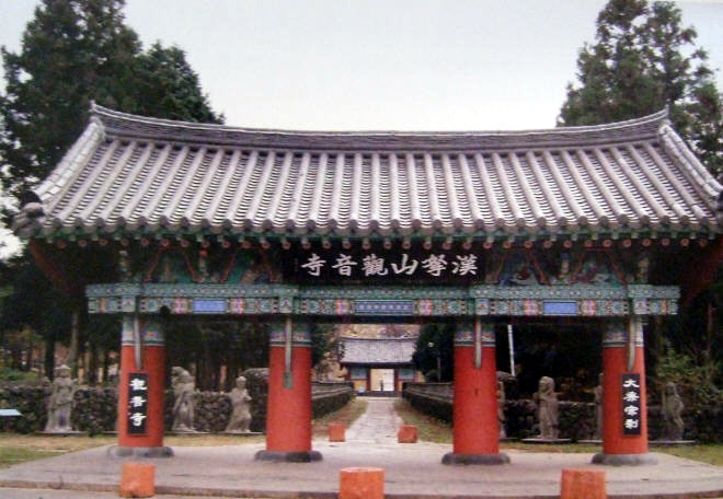 观音寺位于从济州市前往汉拿山国立公园的路上,需要二十分钟的车程。可在体验一下神秘道路(怪坡)之后,再观赏一下四周的小火山(济州的寄生火山),然后前往观音寺。这里因是王樱花的自生地而有名,每到春天,漫山遍野盛开的樱花形成的优美景色令人赞叹不已。如果您运气好的话,还能遇到从山上蹦蹦跳跳从山上下来游玩的野兔,对游人没有丝毫的警戒心。而且从入口处望去,佛像与杉树林间的小路形成和谐的一体,让人感受到一种清凉和四季常青的森林芳香。