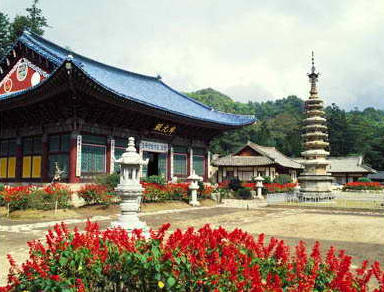 Woljeongsa Temple is located in the forest of the valley east of Mt. Odaesan, and it is composed of 60 temples and 8 hermitages made into one large temple. Woljeongsa Temple was established by Monk Ja Jang(590~658). At Woljeongsa Temple there is the Seongbo Museum where you can view the Buddhist culture of the Goryeo Dynasty(918∼1392), the Octagon shaped 9-story pagoda, also called as the Sari-pagoda(relic pagoda), and the Stone Seated Buddha figure. Also there is the Jeokmyeolbogung where Buddha's bone relics are said to be preserved, and the large sermon hall Jeokgwangjeon Pavilion. Usually in a Jeokgwangjeon Pavilion the Vairocana figure is enshrined, but it is interesting that the Sakyamuni figure is enshrined at Jeokgwangjeon Pavilion at Woljeong temple. Woljeongsa Temple of today is the restored temple after a Korean war in 1950 when the Chilbulbojeon, Yeongsanjeon, Gwaneungjeon, Jinyeonggak and 17 other buildings were burned. Many cultural assets and historic data were lost at this time. The Silla Dongjong, which was excavated from the Seonrimwon site in Yangyang-gun, was also lost. The Budo site (relic site) and sagoji(historic document storage) is nearby Woljeongsa Temple. The Budo site is a 15-minute walk from Woljeongsa Temple to Sangwonsa Temple, just before crossing the Banya Bridge. Here there are 22 pagodas that possess the remains of the monks who had lived here. Sagoji is an hour’s walk from Woljeongsa Temple in the Sangwonsa direction near Yeonggamsa Temple.